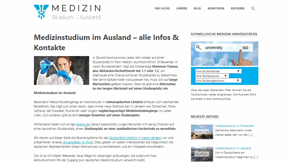 Es gibt viele Quelle, eine gut gestaltete und übersichtliche Internet-Seite mit vielen länderspezifischen Studienführern, Universitäten im Profil und Kontakt zu vermittelnden Agenturen ist https://www.medizinstudium-im-ausland.de.